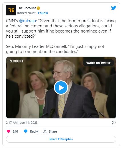 The Senate Minority Leader was questioned by CNN's Manu Raju: "Given that the former president is facing a federal indictment and these serious allegations, could you still support him if he becomes the nominee, even if he's convicted?"